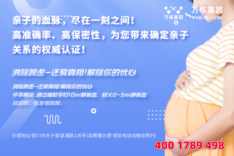此外还有永宁dna胎儿亲子鉴定,如:怀疑孩子非亲生,又不想其他人知道的。当然,这只是其中的一些例子,更多鉴定问题在线咨询,永宁办理地址:银川市永宁县望通路236号(如需要办理 提前电话或微信预约)-预约电话:4001789498。